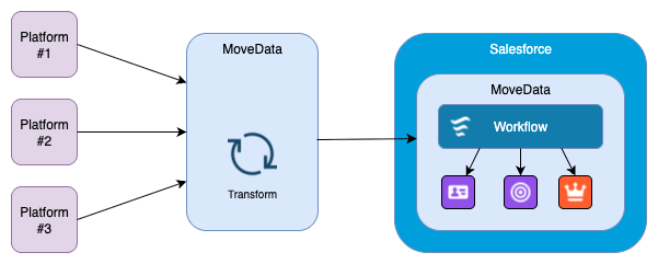 MoveData's architecture follows a sophisticated three-stage lifecycle that transforms every meaningful fundraising interaction into actionable Salesforce data. This process operates continuously, handling everything from individual small donations to large-scale campaign activities with equal precision and reliability.