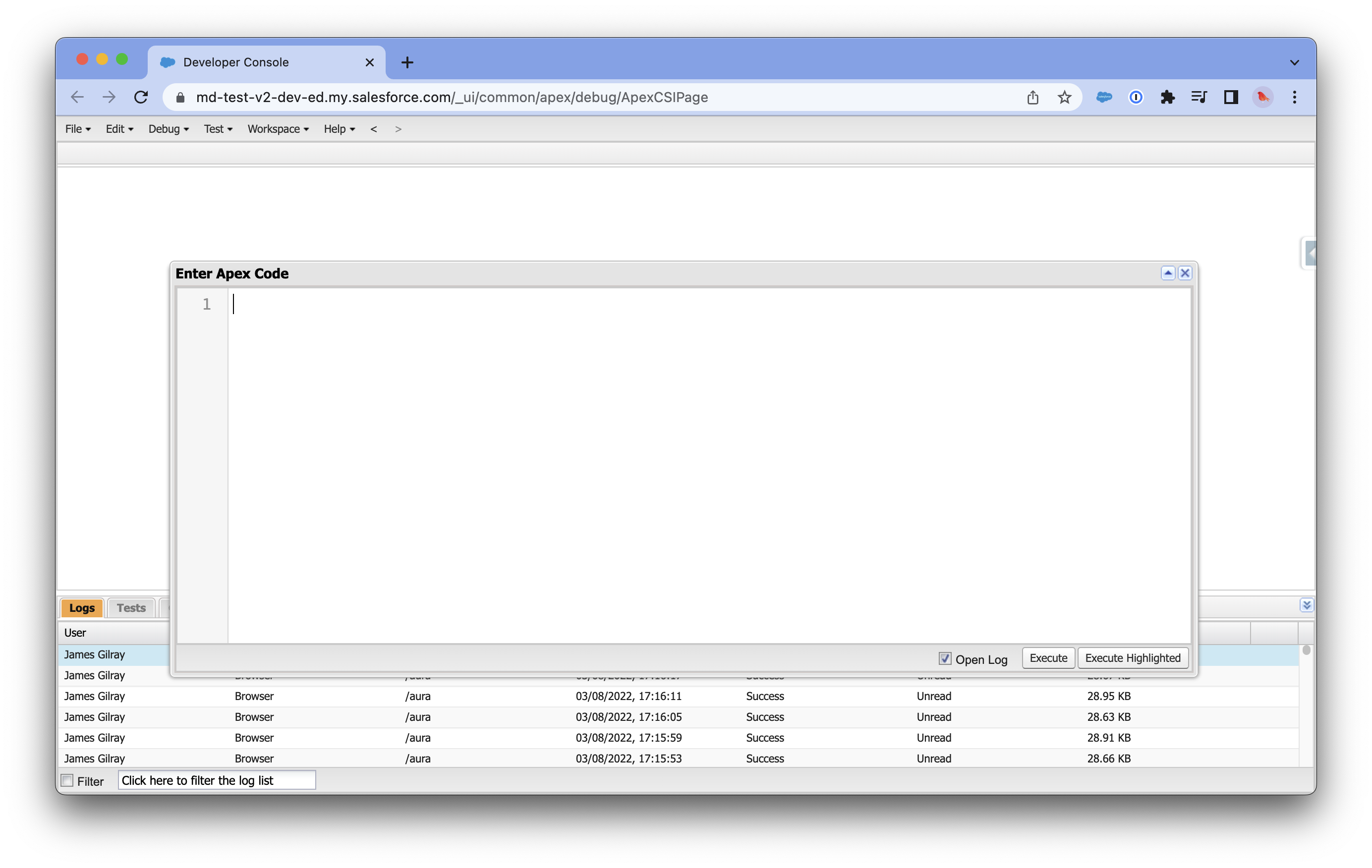 3. Paste the below script into the Enter Apex Code window. When you do this, ensure the Open Log checkbox is ticked. This will open a log to enable us to see if the job is complete. Click Execute to run the script.