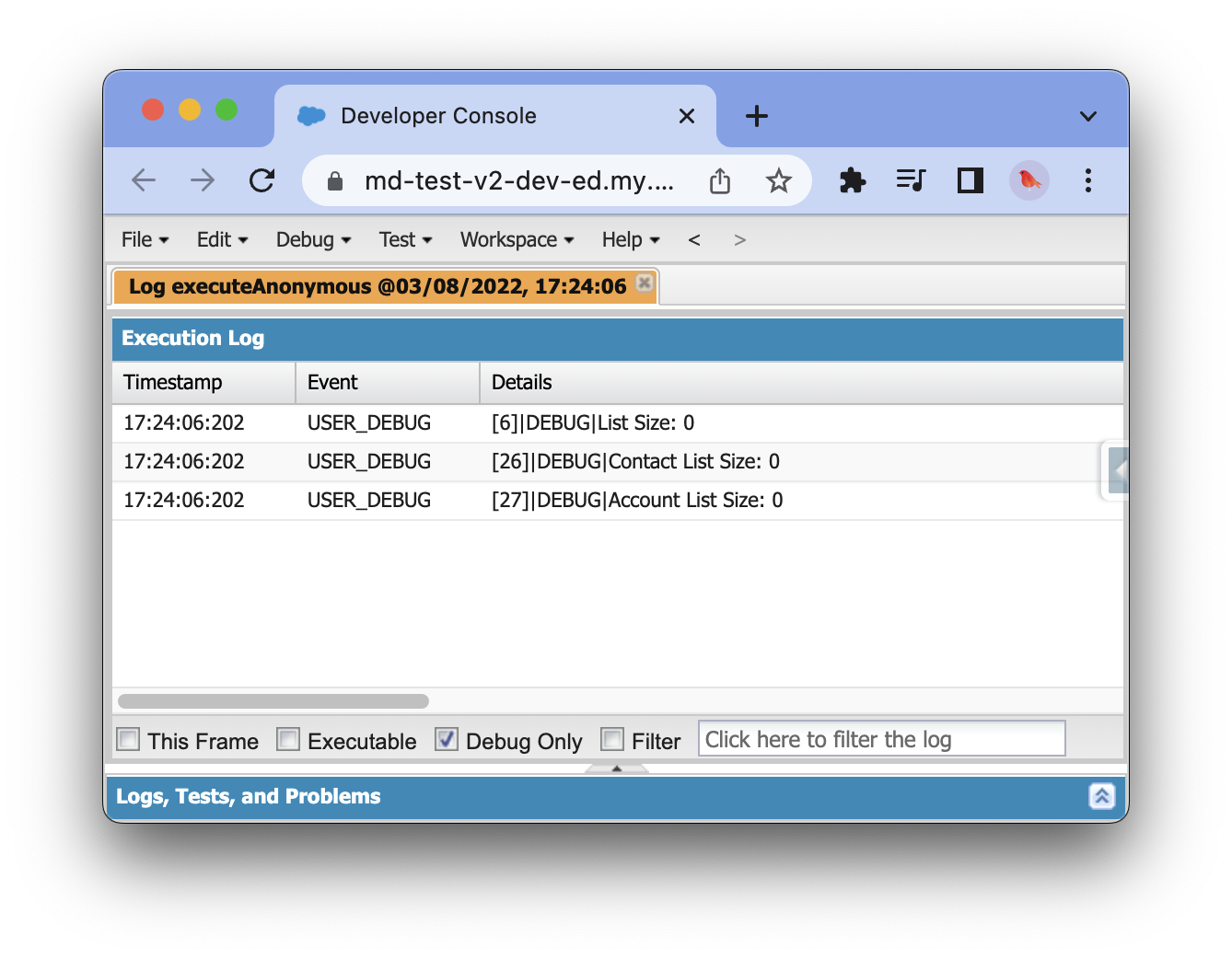 4. Once the execution has completed, the log should open automatically. Click the Debug Only toggle to identify the number of records which have been migrated in that execution. If List Size in the debug output is greater than 0, then rerun the script. Rerun until you get to 0. Once all records are migrated, the Debug Log (with the Debug Only toggle checked) will look like this:
