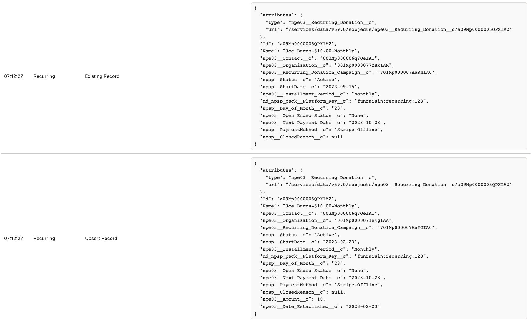 Over time, and typically due to manually modifying records in Salesforce, a scenario can occur where the source platform issues information which is different to the contact or account assigned to your recurring donation.