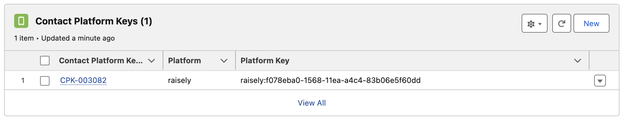 Platform Keyas a related list on your Contact Page Layout - Add the generated platform key to your existing contact: