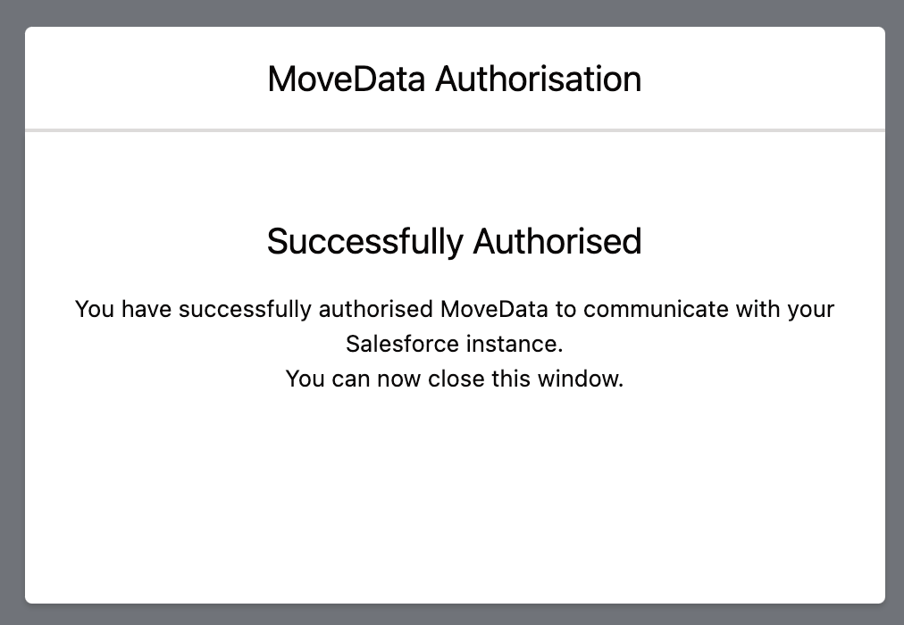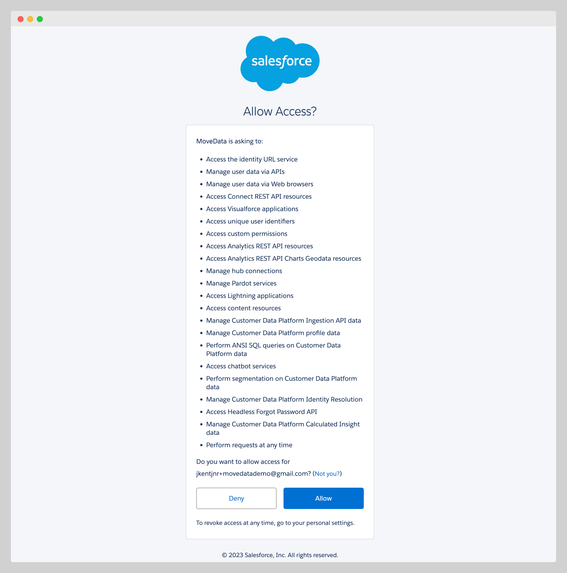 MoveData requires permission to access your Salesforce instance. This is to facilitate the pushing of notifications from connected platforms into Salesforce. This article details the options available to an organisation regarding the authorised user and associated permissions.