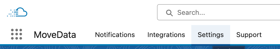 To specify the user MoveData is to execute under you first need to login as the desired user. Once you have logged in, open MoveData using the Salesforce App Launcher and select the Settings tab. If the MoveData application is not visible in the App Launcher, the logged in user does not have the requisite permissions required to administer MoveData