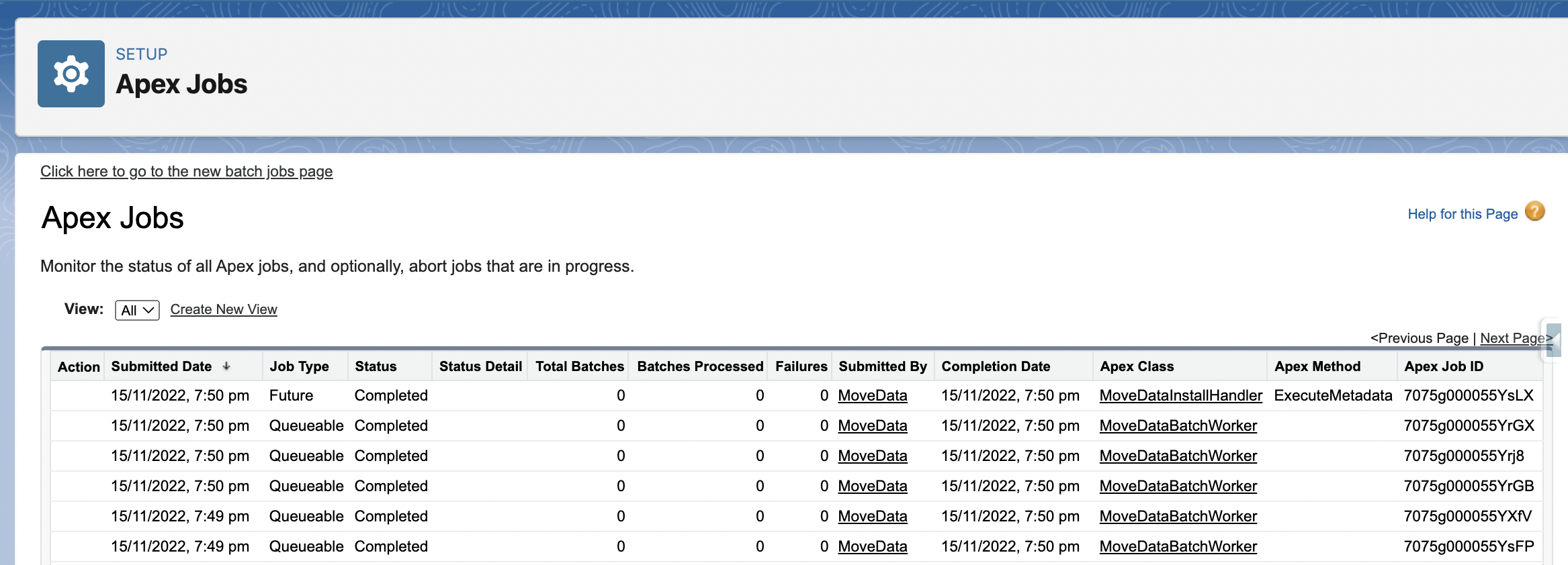 When you undertake the upgrade, MoveData will execute an Apex job called MoveDataBatchWorker. It is important to ensure this has executed successfully. You can confirm this via Setup → Apex Jobs.