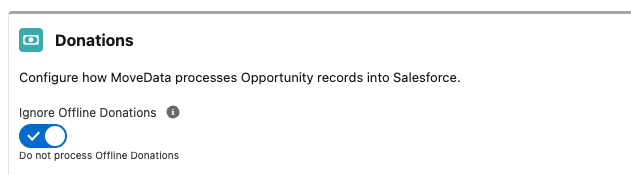Offline Events will be treated the same as other events. By default, MoveData will filter these unless the Ignore Offline Donations toggle is set to false.