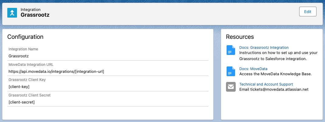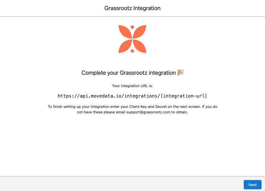 Once you have received your Client Key and Secret, open MoveData from the App Launcher and click Integrations → New Integration and select Grassrootz.