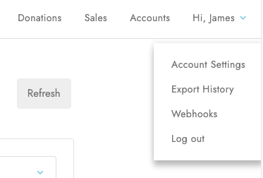 Open your Grassrootz Admin panel and click Webhooks under Hi, [Name] from the top right hand side: