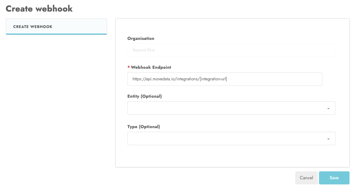 Select Create Webhook and enter the integration URL from your MoveData account and click Save: