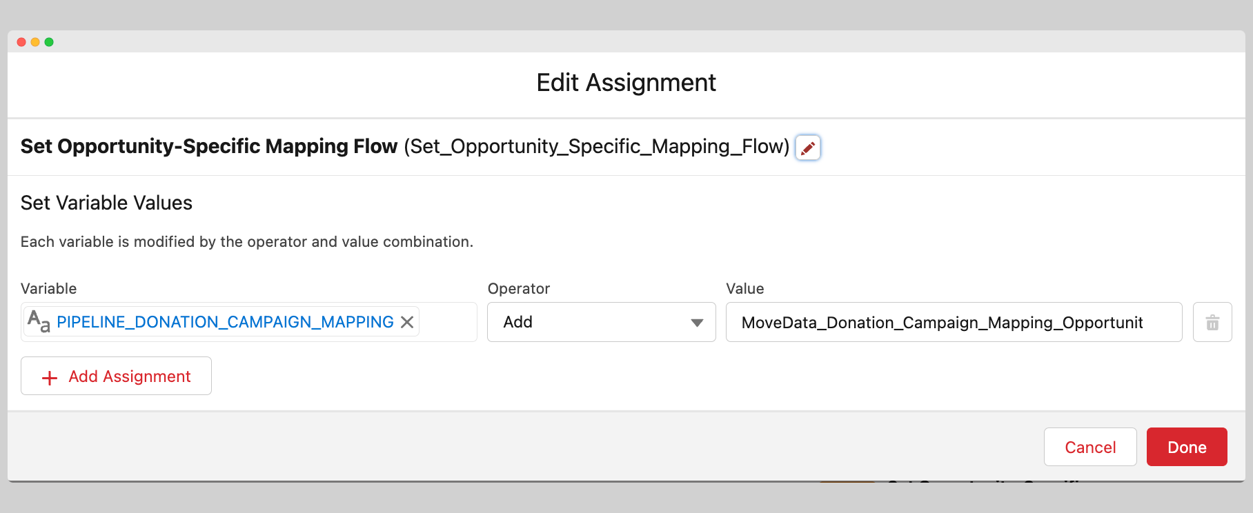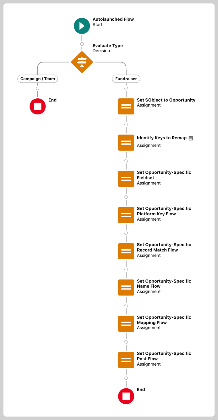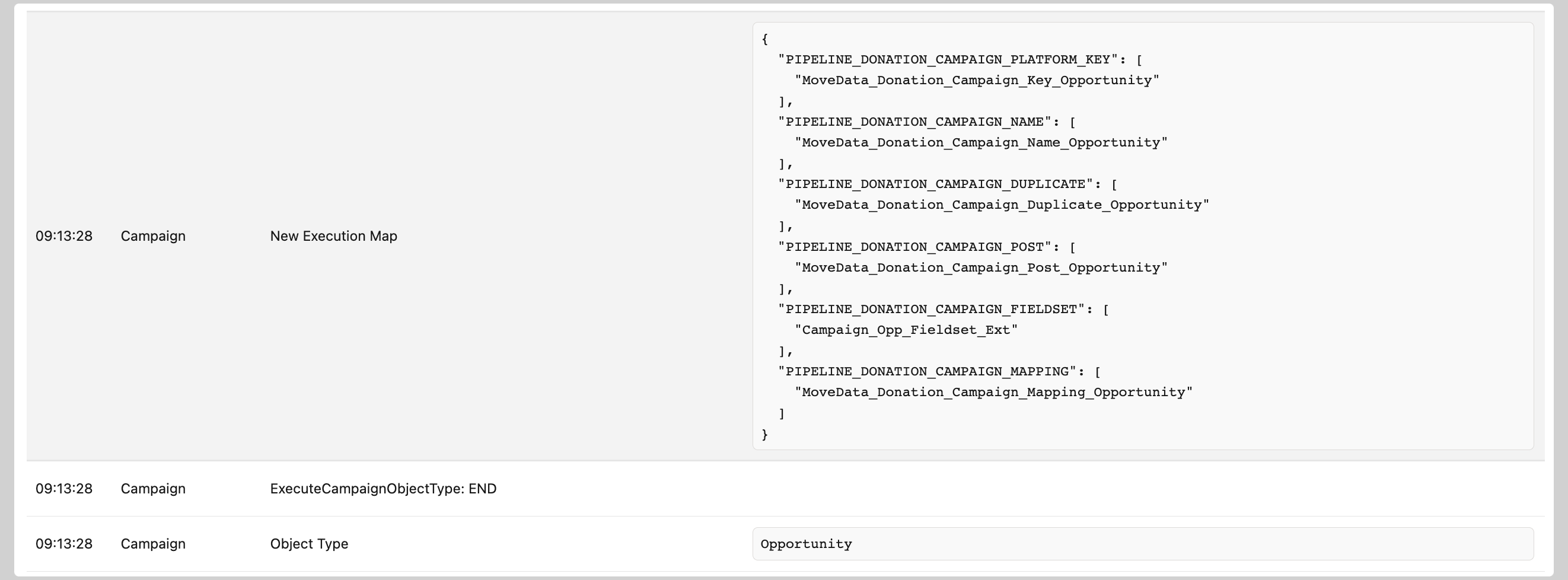 MoveData is directed by Pipeline Metadata Entries; these tell the engine when to execute specific Pipeline Metadata flows. For this example, we have installed the MoveData NPSP Extensions which adds a suite of metadata entries to execute its flows. When we have a campaign Type of fundraiser, we have determined we want to work with an Opportunity record. This means we will need to dynamically set alternative metadata that works with the Opportunity object.