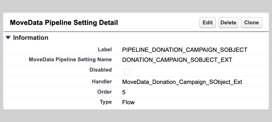 We need to register our new SObject flow for the Campaign phase. This is done by creating a new entry in the MoveData Pipeline metadata settings with following details: