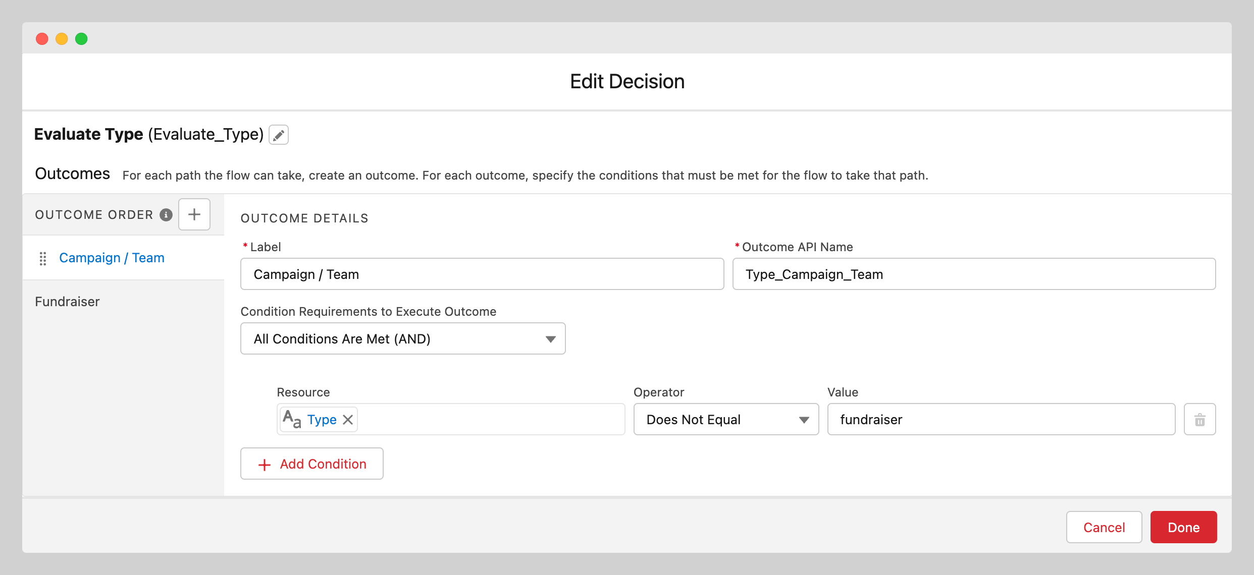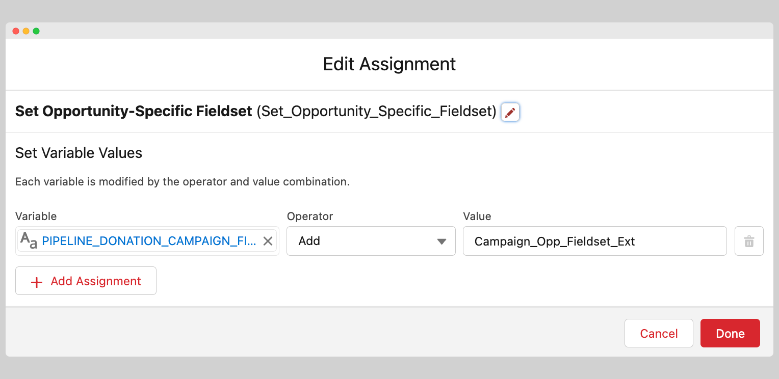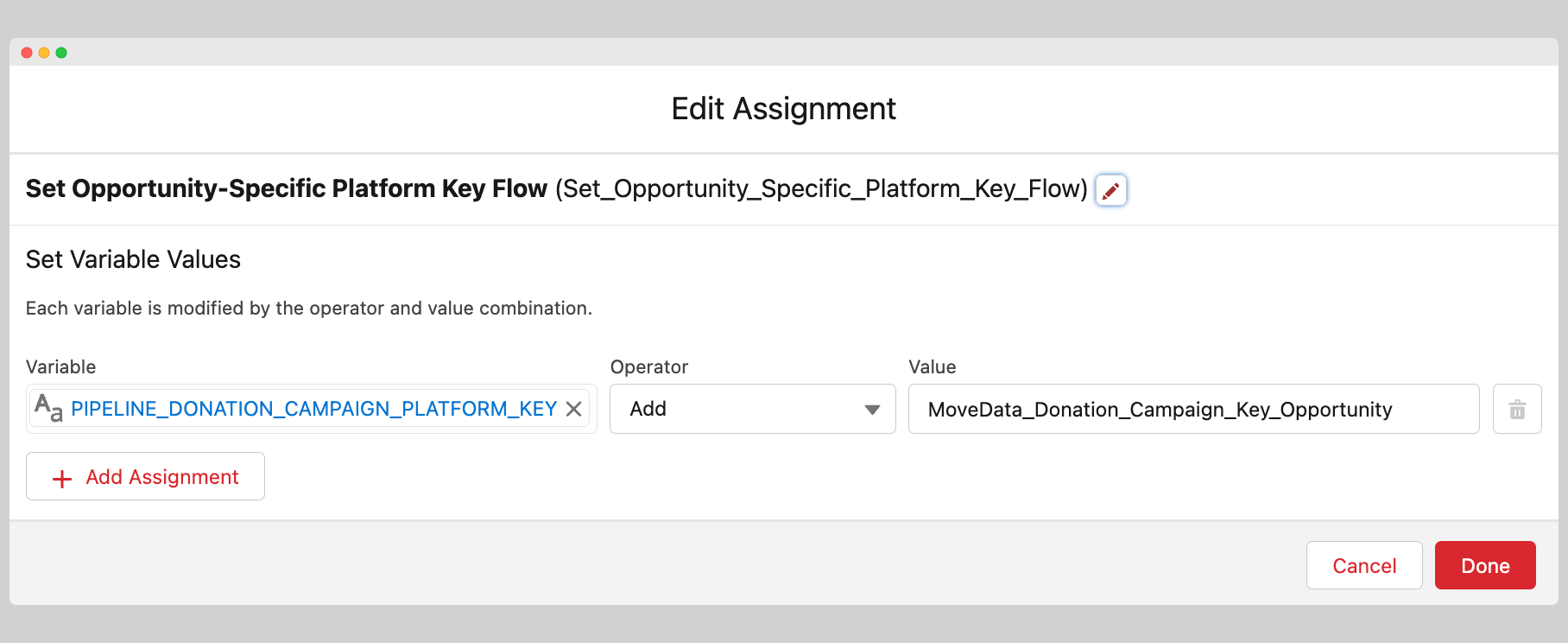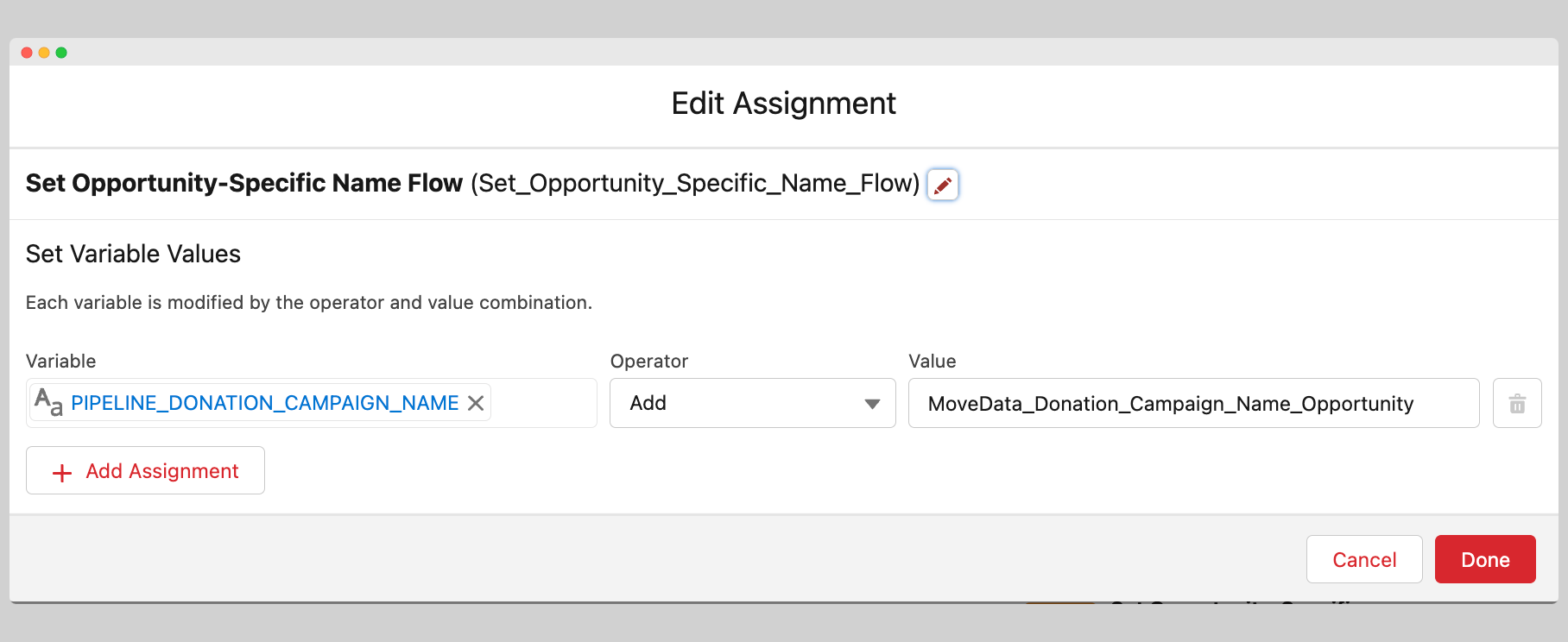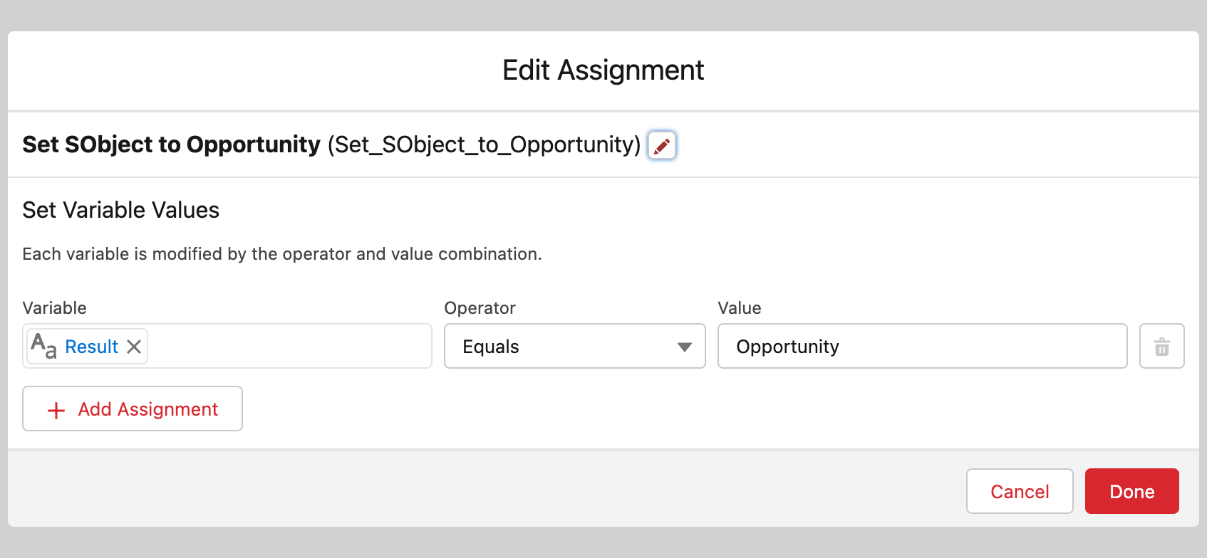 This step sets the output-enabled Text variable Result to Opportunity. The value that must be used is the API name of the SObject. If you are using a custom object, this will look like Fundraiser__c. If the custom object belongs to a namespace, it will look like npsp__Fundraiser__c.