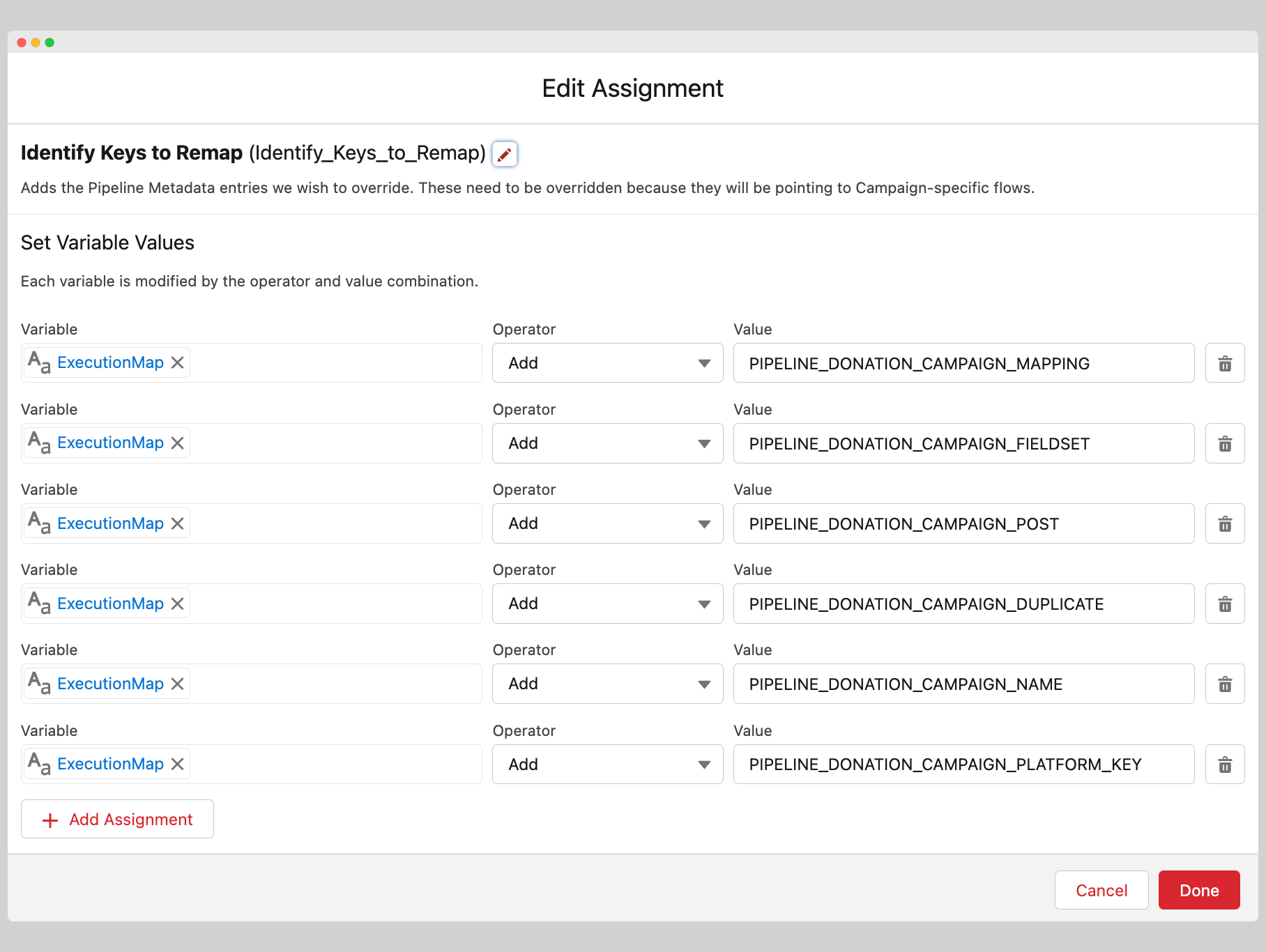 To do this, we need to create an output-enabled Text collection variable named ExecutionMap that will contain all the replacement metadata keys. The keys we replace can be found in the appropriate extension documentation; the Fundraising & Donation extension documentation (link).