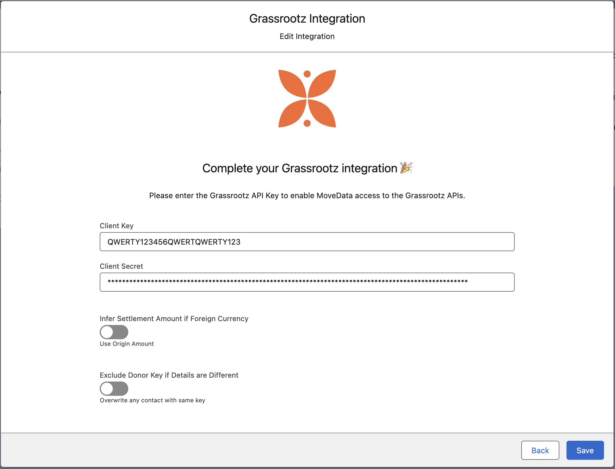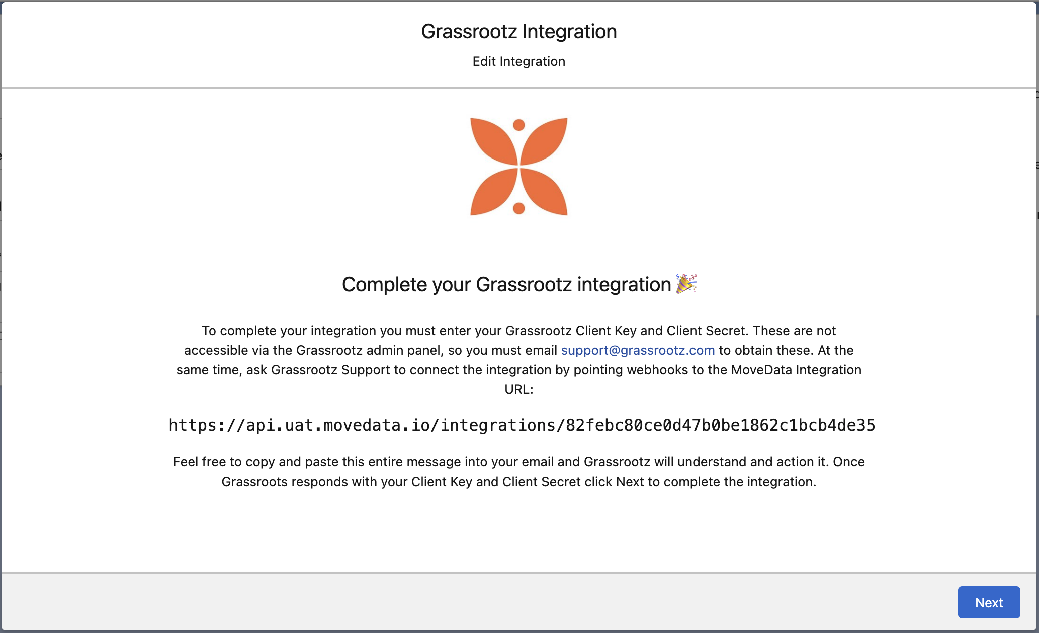 To complete your integration you must enter your Grassrootz Client Key and Client Secret. These are not accessible via the Grassrootz admin panel, so you must email support@grassrootz.com to obtain these. At the same time, ask Grassrootz Support to connect the integration by pointing their webhooks to the MoveData Integration URL.