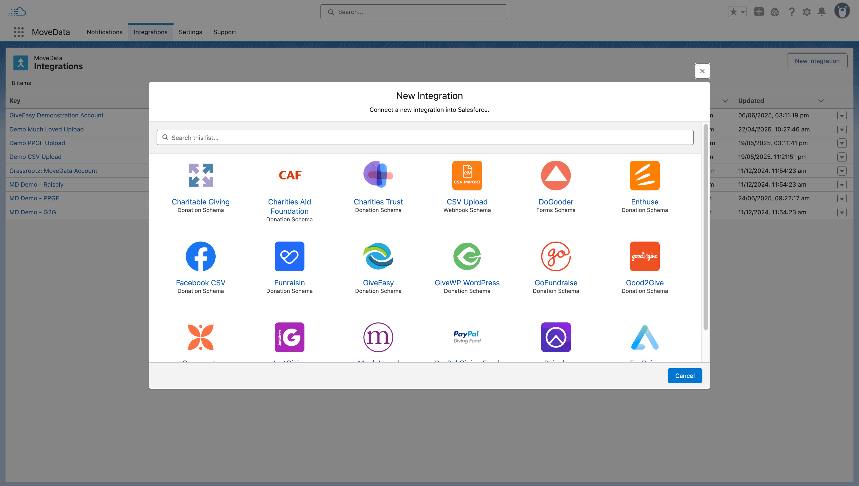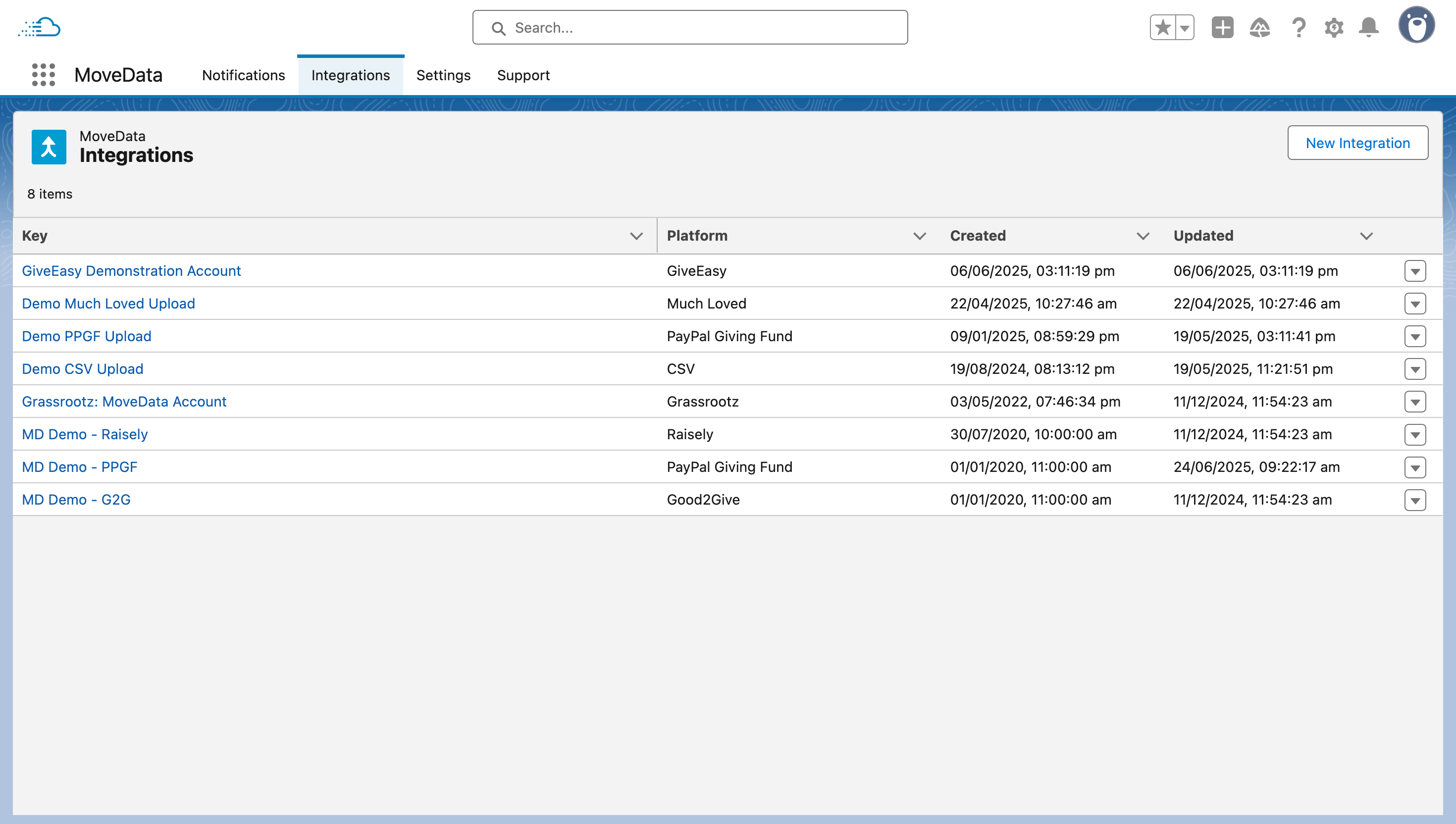 MoveData integrations are the connections between your fundraising platforms and Salesforce, enabling data synchronisation. The Integrations interface provides comprehensive management capabilities for setting up and maintaining these critical data connections that power your organisation's fundraising operations.