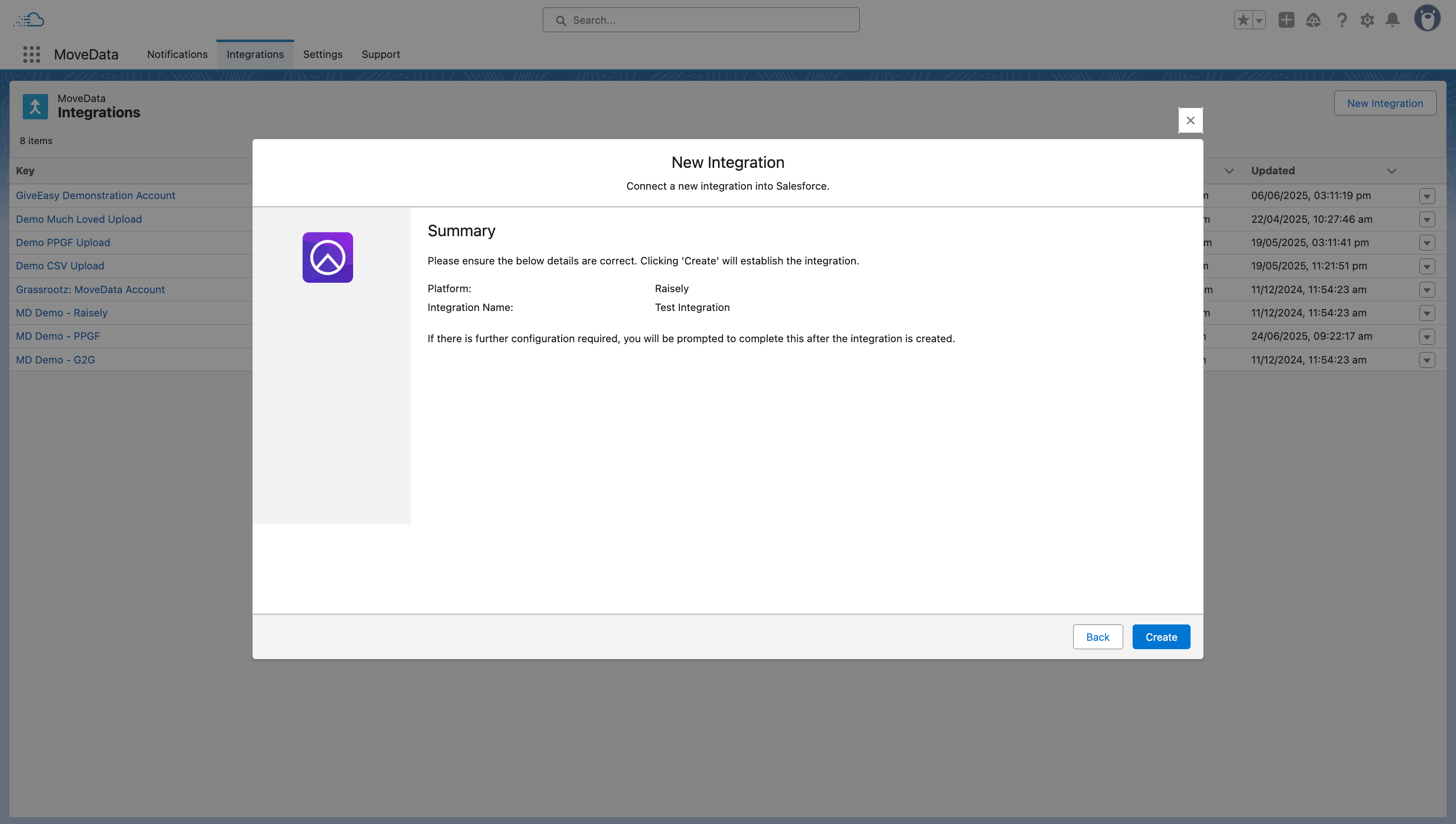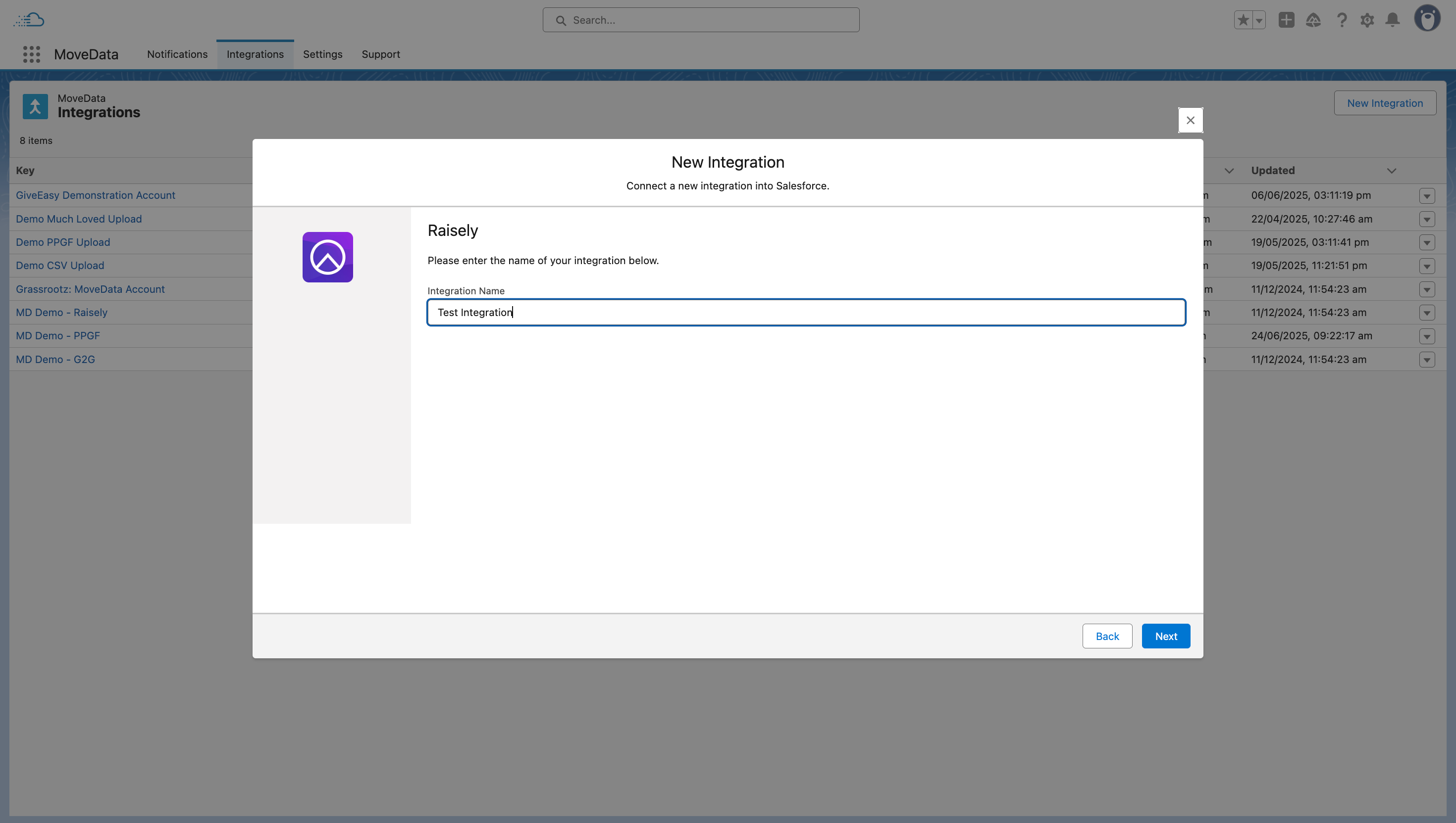 - Access Integrations: Click on the "Integrations" tab within the MoveData Lightning application